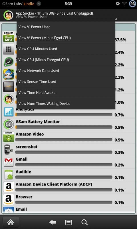 * Lists showing app usage allowing sorting such usage, Sensor usage, Wake Locks, Wake Time, etc.